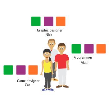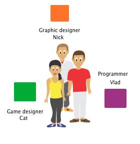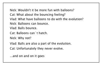 From knowing a little bit more about Cat, Vlad and Nick we can tell that Cat, the game designer, was trying to keep track of the premise and goal of having a nice bouncing feeling of an egg that travels through the evolution of life avoiding to hatch. Nick, the graphic designer, suggests a new angle to the idea by suggesting balloons instead of an egg as to ensure that all possibilities have been considered. Since the programmer, Vlad, has already worked on a solution to make a bouncing ball into a spherical bouncing egg the suggestion about balloons makes Vlad feel that Cat and Nick don’t understand the scale of changing objects from the perspective of programming.