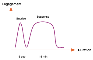 Furthermore, from understanding how a surprise can be seen as fifteen seconds of engagement and where suspense, depending on who directs the learning, the experience can be everything from fifteen minutes to endless. In this way it also makes sense when we are setting a framework for an experience of a desired outcome in creation of an experience in a game why the definition of a feeling and emotion to learning, as to achieve a goal, make sense from a narrative and cognitive perspective that concerns the pacing and control – beyond structures and templates.
