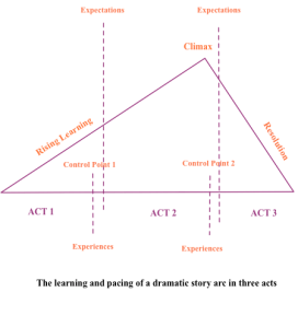 In the third part, you can, for example, find a similar description of the five steps applied to a three-act structure, which describes the control and pacing in building experiences in relation to expectations.