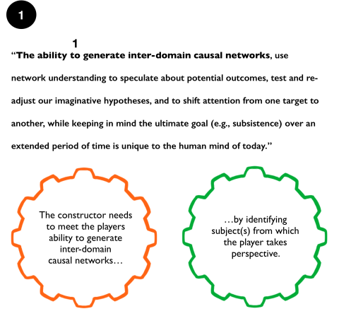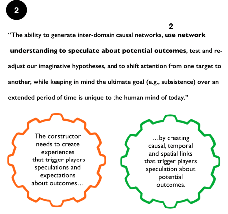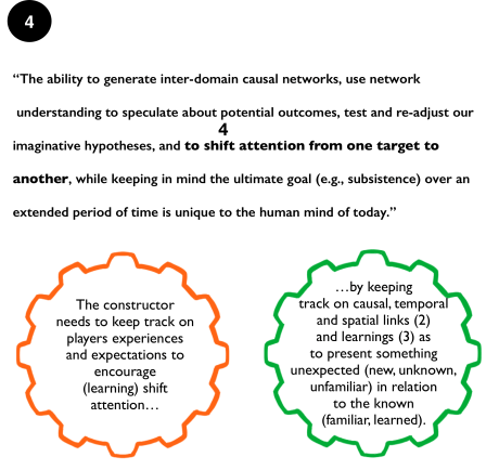 The description of how our thinking works is a bit tricky to access as the core cognitive activities are performed on an intuitive level. I will repeat the citation in five steps. At each step, I will point to a specific part of our core cognitive activities and add a description of the operations performed from a narrative constructor’s (designer’s) perspective in the creation of an engaging experience that attends to how our learning and emotions work.