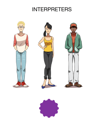 To illuminate how the causal elements (meanings) are withheld and provided through the plotting to engage the receiver’s understanding and learning, I will bring the team interpreters from the previous part, and let a purple cogwheel point out the interpreter’s building of experiences from learning about the world and the hobbits.
