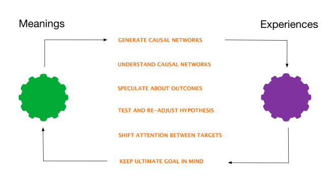 To sum up how a bottom-up perspective on the hands-on process can assist your design in creating engaging and motivating forces. By tracing back to where the core of engagement and motivation reside, we can see how two causality-creating elements create triggers for the narrative vehicle of meaning making to generate new patterns.