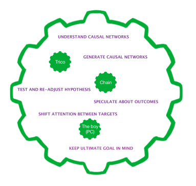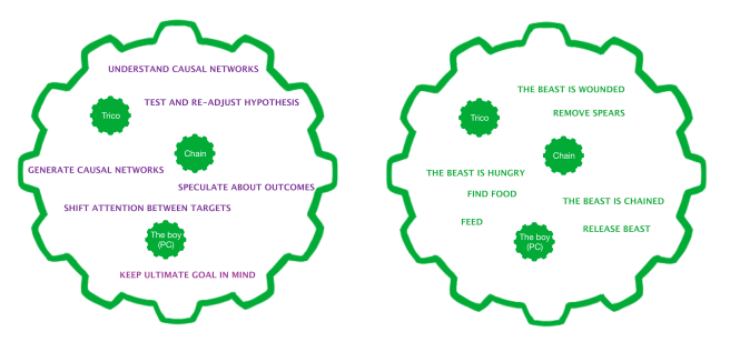 Hidden to the player is the motivating engine of learning that encourages the flow-state of curiosity to build a feeling of competence from learning while moving towards liberty (8) and dependency (9). Underneath the structure, the bond between the player and Trico gradually builds.