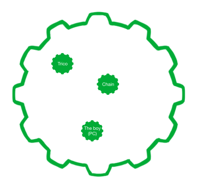 – the space of activities of being trapped: a closed cave and Trico confined by a chain and pierced with spears, illuminating the incentive (goal) on liberty.
