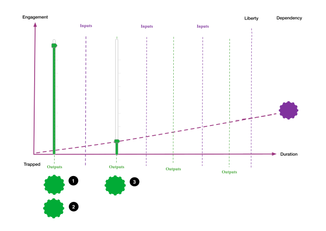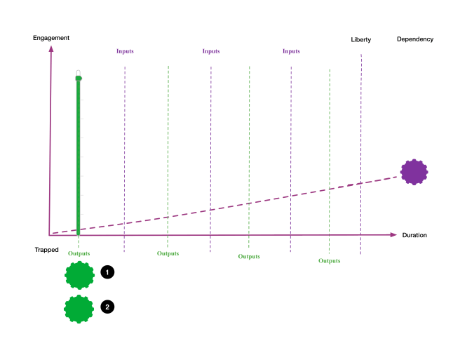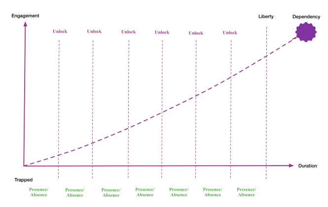 The mechanic’s output, which goal-state is on the building of dependency, creates a forte (1) through how the plot and style convey the causal conditions of the confinement through the visualization (2), thus creating an incentive to attain the overall goal of liberty.