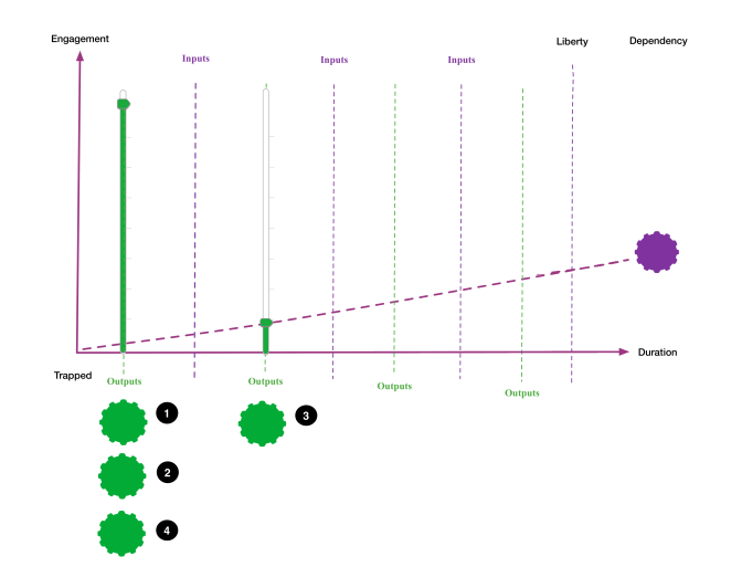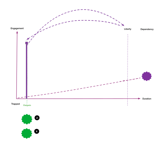 By shifting perspective to the player (and changing color to purple), based on the outputs (2 and 4), the illustration below shows how the future goal on liberty is imagined from the player´s position on the timeline. The image also visualizes how the player´s processing of causal, spatial, and temporal links doesn’t have to generate inputs from physical movements even though the engagement is high (see the example from the last part regarding The Long Dark).