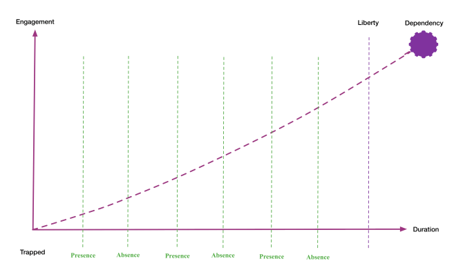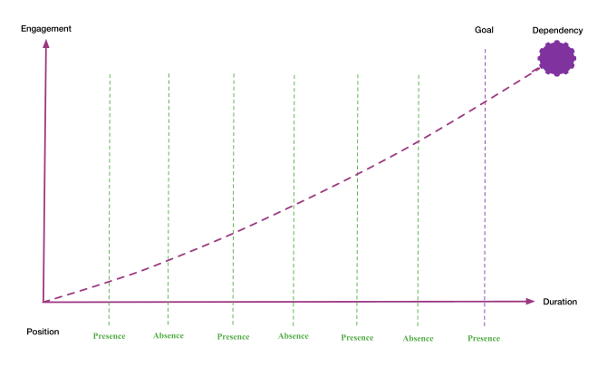An example based on the contrasts of absence and presence, which generates a behavior of avoidance, is Red Dead Redemption 2. The core rhythm loop is based on the presence and absence of an agent. When the agent is absent, the player feels safe, and when the agent turns up, the insecurity prompts the player and his gang to leave their camp and flee to another one. With a simple switch, the mechanic’s state is changed from the experience of dependency to independence and the feelings of being unsafe and safe.
