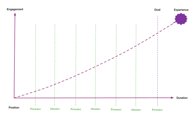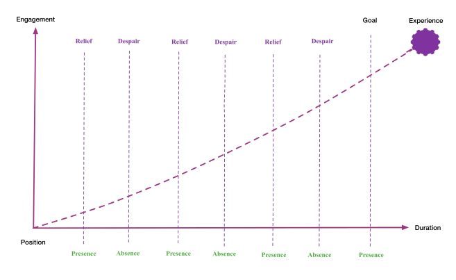 As a result of the stripping of the dramatic story structure, and the removal of its standard features (acts, turning-points, rising and falling actions), the previous part revealed a learning curve. The flow-state of the learning curve (illustrated below) shows the motivating engine by how the receiver gradually builds experiences and feelings on the path towards the goal.